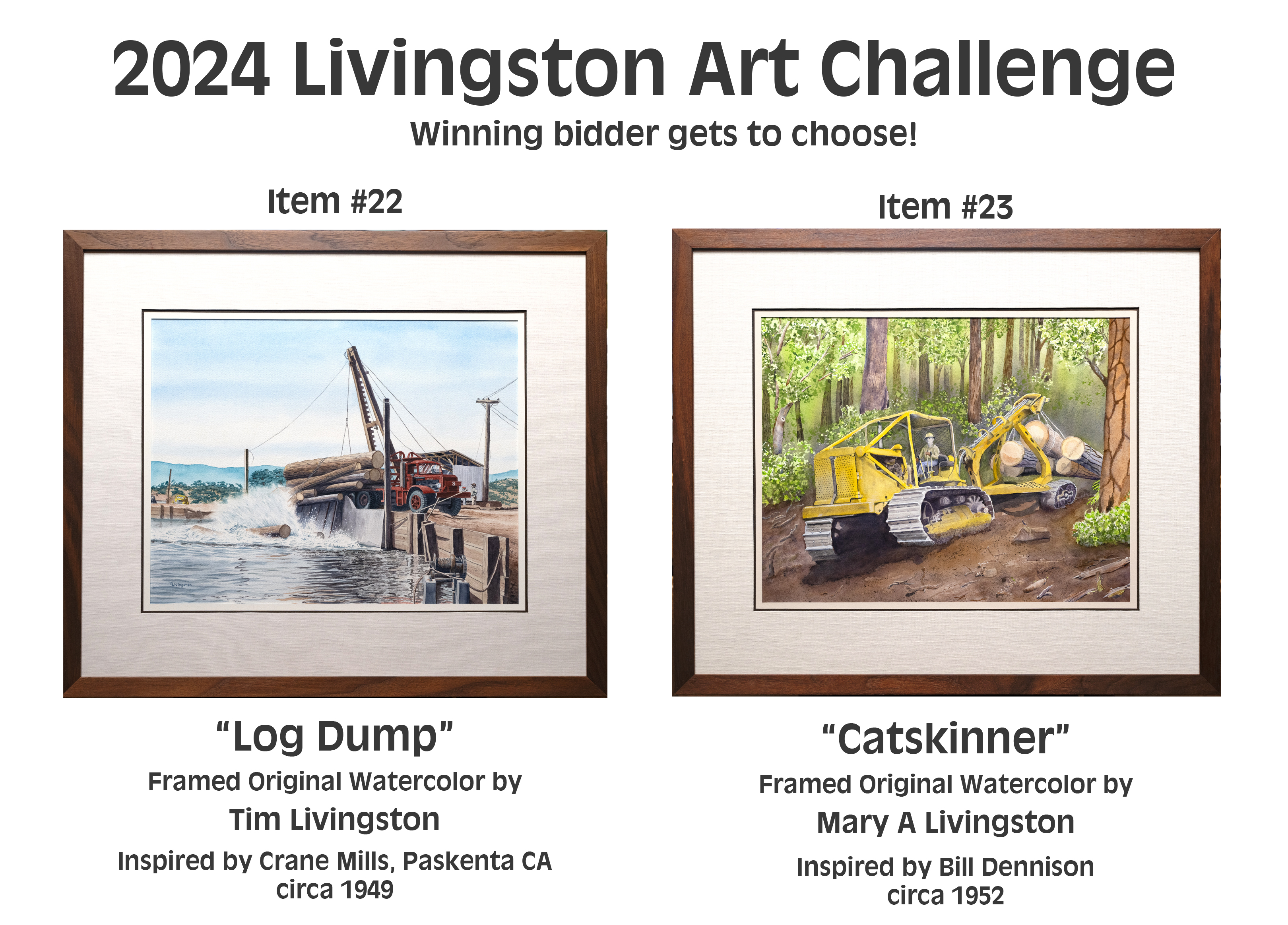 Tim and I each paint an original watercolor. We have them professionally framed. Tim donated “Log Dump,” and I donated “Catskinner” to the Sierra-Cascade Environmental and Resource Fund auction.