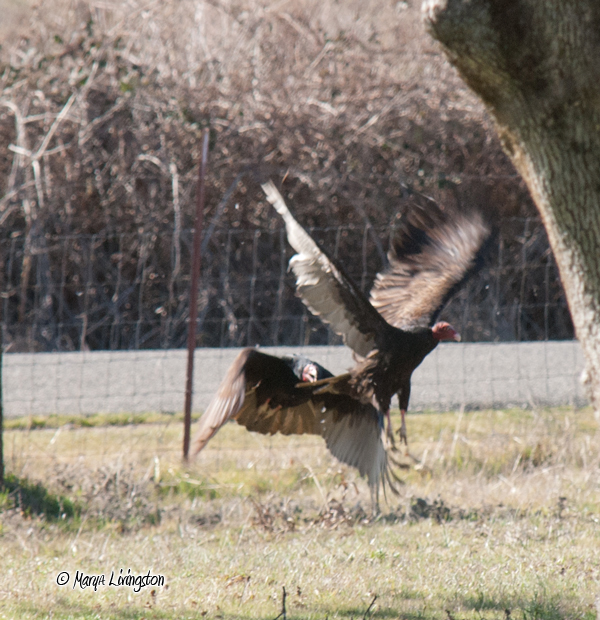 I grabbed the camera and sneaked out the office door and around the side of the house. The one on the gate spread its wings, as vultures often do when sunning themselves. The posture was a bit more intimidating than the usual bask in the sunshine. Then the one on the ground spread out its wings.