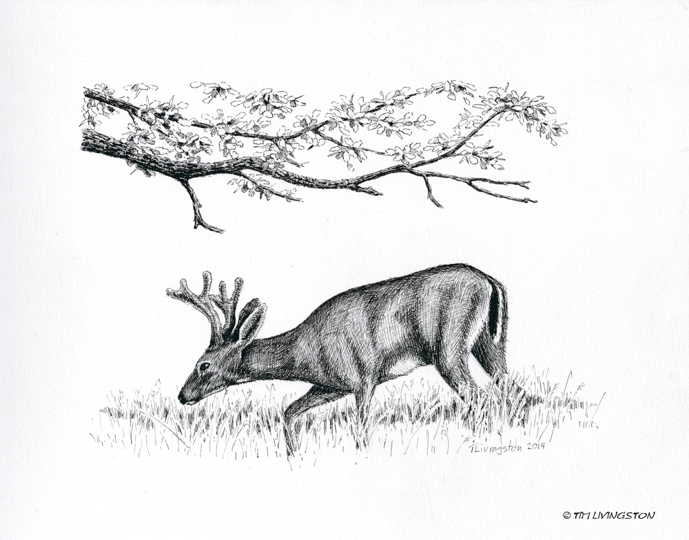 A Spring black tail buck with horns still in velvet in pen and ink.