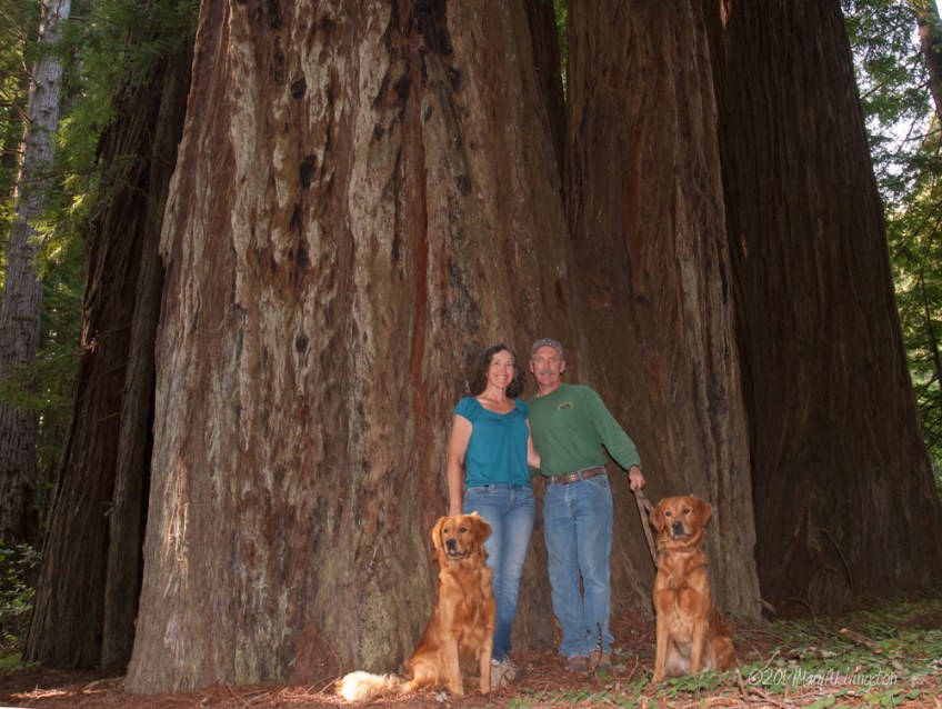 At the base of a Coastal Redwood tree. L-R: Kinta Mary, Tim, Sailor