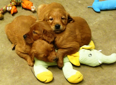 Sailor rests on his siblings. Image courtesy of Jill Flament, Saturday Night Golden Retrievers.